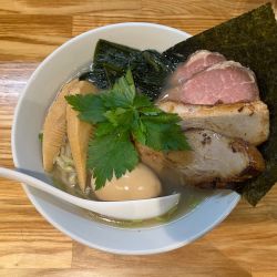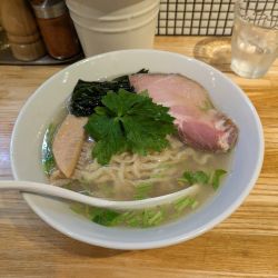 貝の風味溢れるスープと平打ち縮れ麺で、グイッと旨味を押し出していて、醤油のそれとは違った力を感じるラーメンです