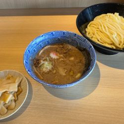 少しトロリとしたつけ汁はオイリーなので麺によく絡む。辛さも程よく刺激的で好みのタイプ。極太麺はもっちり食感が良い感じ。
