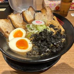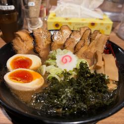 12時30分頃お店到着。まずは店頭の券売機で食券を購入します。インバウンド客狙いの高額ラーメン多数。初訪問なので最上段、左側の特製濃厚豚骨醤油ラーメン(1650円)を購入。ちょっと高いなぁと思いつつ。